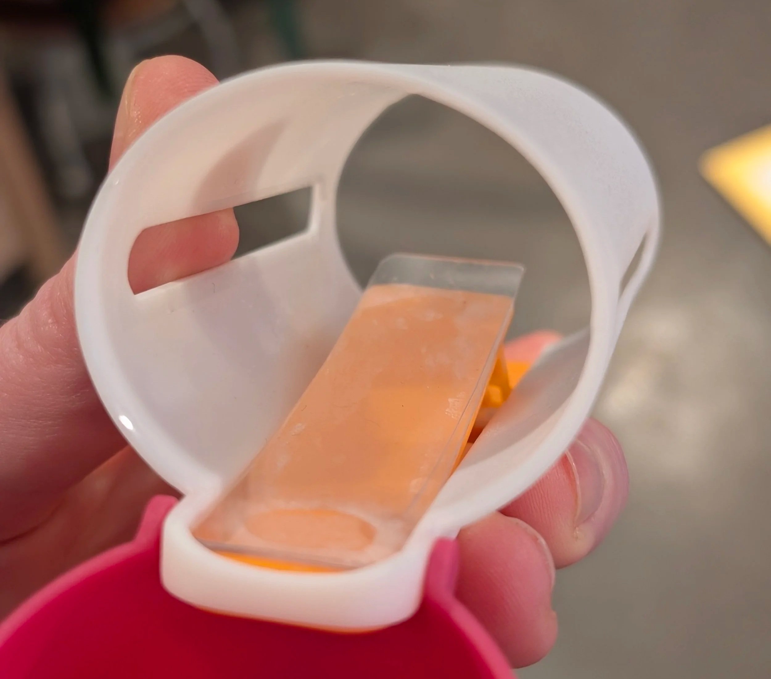 I spun out 3 variations of my 3D model to print and evaluate. Each model changed one dimension listed above. I then tested each model against my existing device and whittled down which items to dial in further. The result is a device with a thicker dropstopper spring arm, holding more of the donut, and with a slightly smaller lever arm.