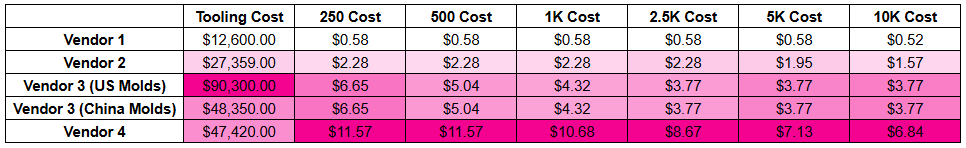I tried to quote head to head as much as possible, requesting the same timelines and number of molds and lifetime specifications. I made a table to compare the total unit costs at various production quantities and added some fancy conditional formatting to make it easier to read: