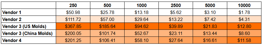 Vendor 3 was kind enough to provide quotes with molds made in China and shipped over, and molds made in the US. I think it’s fascinating the difference in the costs there. Note that the per unit price is still the same though, since the molding happens in the US.
